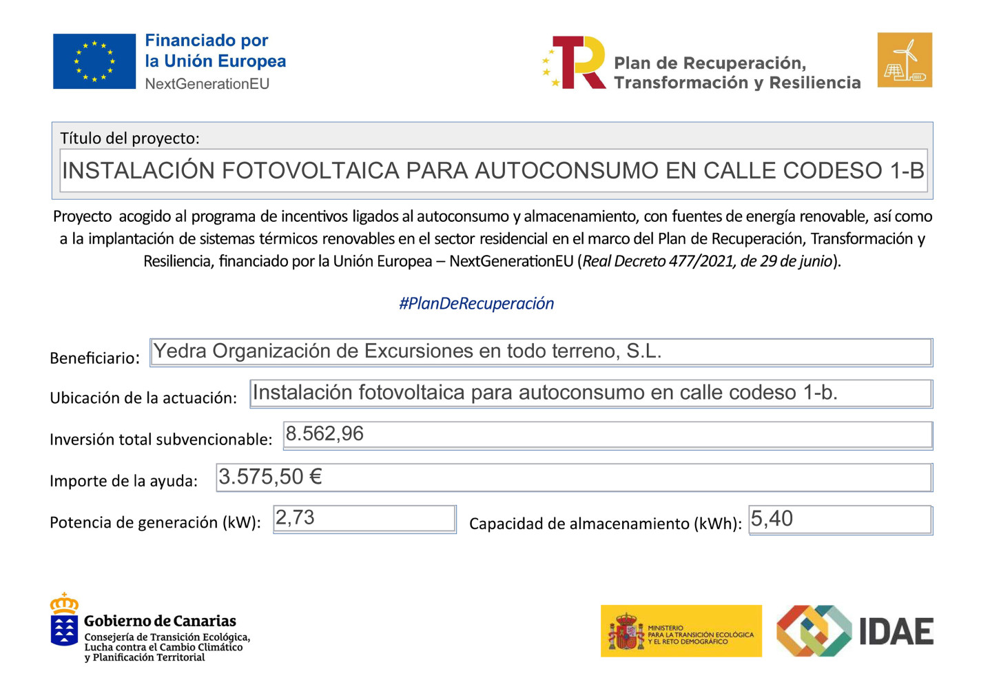 Proyecto acogido al programa de incentivos ligados al autoconsumo y almacenamiento, con fuentes de energía renovable, así como a la implantación de sistemas térmicos renovables en el sector residencial en el marco del Plan de Recuperación, Transformación y Resiliencia, financiado por la Unión Europea - NextGenerationEU